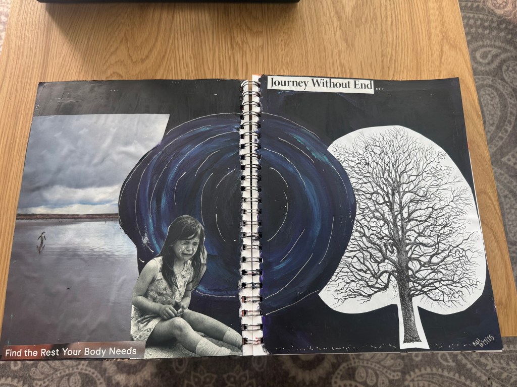 Now as I write this, I am both sitting in the corner of the sectional and also sitting above me watching warm tears slowly slide down my dehydrated face. I can feel the heat of the tears, so I know I am still here in the room. I jump between both views when I need a break from one or the other. Eleven months after you died, and I still struggle to fully integrate your death with the feelings of absolute despair about it. This lack of integration is so devastating. I am in 16 hours of therapy a month. I pay for it all on a credit card because I cannot afford it, but I do not know how else to help myself. I allocate 4 hours to verbally talking about what happened and continues to happen as I open new layers to my grief. I spend 4 hours in an art therapy group procesing in a collective the experience of grief by making art about it. I have 4 hours (2 sessions for 2 hours) of 1:1 grief art therapy because 4 in the group once a month was not enough. And I am now adding one hour a week of brain spotting to help with the panic attacks and overwhelm in my body. 16 whole hours trying to process what happened when you died and the fact that you are not here anymore. And it is still not enough and I would do more if I could. I do not want to keep jumping from reality to not reality. I am exhausted by it. And I am terrified I will always feel like this.